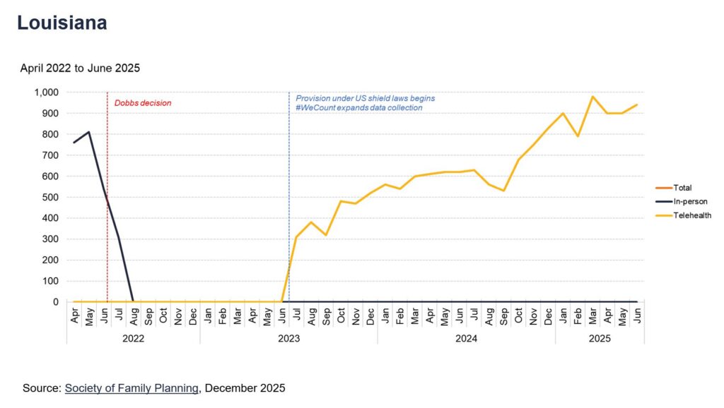 Perhaps one of the most egregious examples of the fallout from this can be found in Louisiana. Local outlet WWNO compiled recent data to show that the Pelican State, despite prohibiting abortions outside of narrow exceptions post-Dobbs, has seen more mail-order abortions in 2024 (7,510) than the total clinic-provided abortions in 2020 (7,473) and 2021 (7,444). And in 2025, the data from the #WeCount report shows that there are nearly 1,000 mail-order abortions per month.
